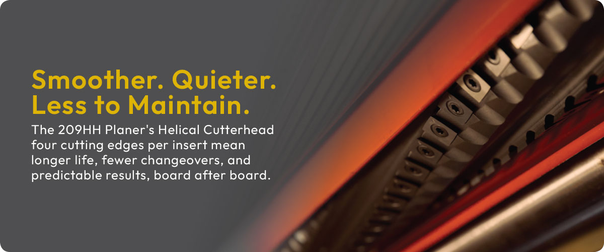 - Helical cutterhead with 100 four-sided carbide inserts produces a consistent surface finish while lowering cutting noise and tear-out