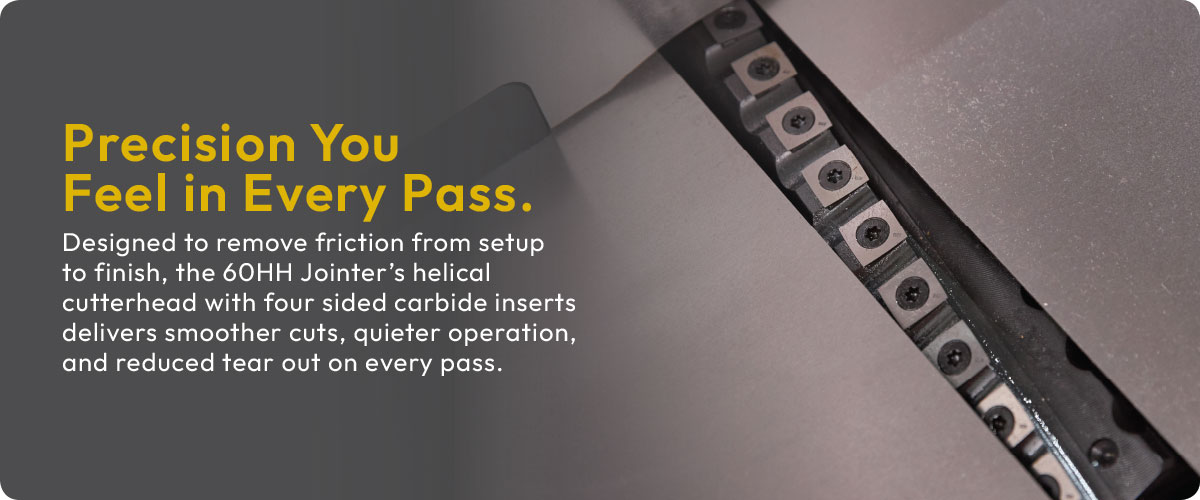 - Helical cutterhead with 54 four-sided carbide inserts delivers a smoother surface finish while reducing noise and tear-out during jointing